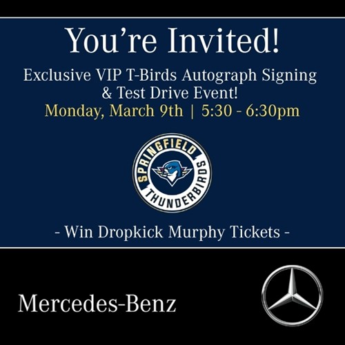 Join us for a Thunderbirds for autograph signing and enter to win Dropkick Murphy Concert tickets & receive $500 towards a new vehicle! Mercedes-Benz of Springfield is teaming up with the Springfield Thunderbirds for an exclusive night you don’t want to miss! 🏒 Meet & greet a Thunderbird player ✍️ Autograph signing 🎟️ Be entered to win Dropkick Murphy concert tickets 🚘 Test drive a Mercedes-Benz and receive $500 off a new vehicle & T-Birds game tickets March 9, 2026 | 5:30 PM – 6:30 PM Mercedes-Benz of Springfield FREE to attend Spots are limited — come early and drive away with VIP perks!